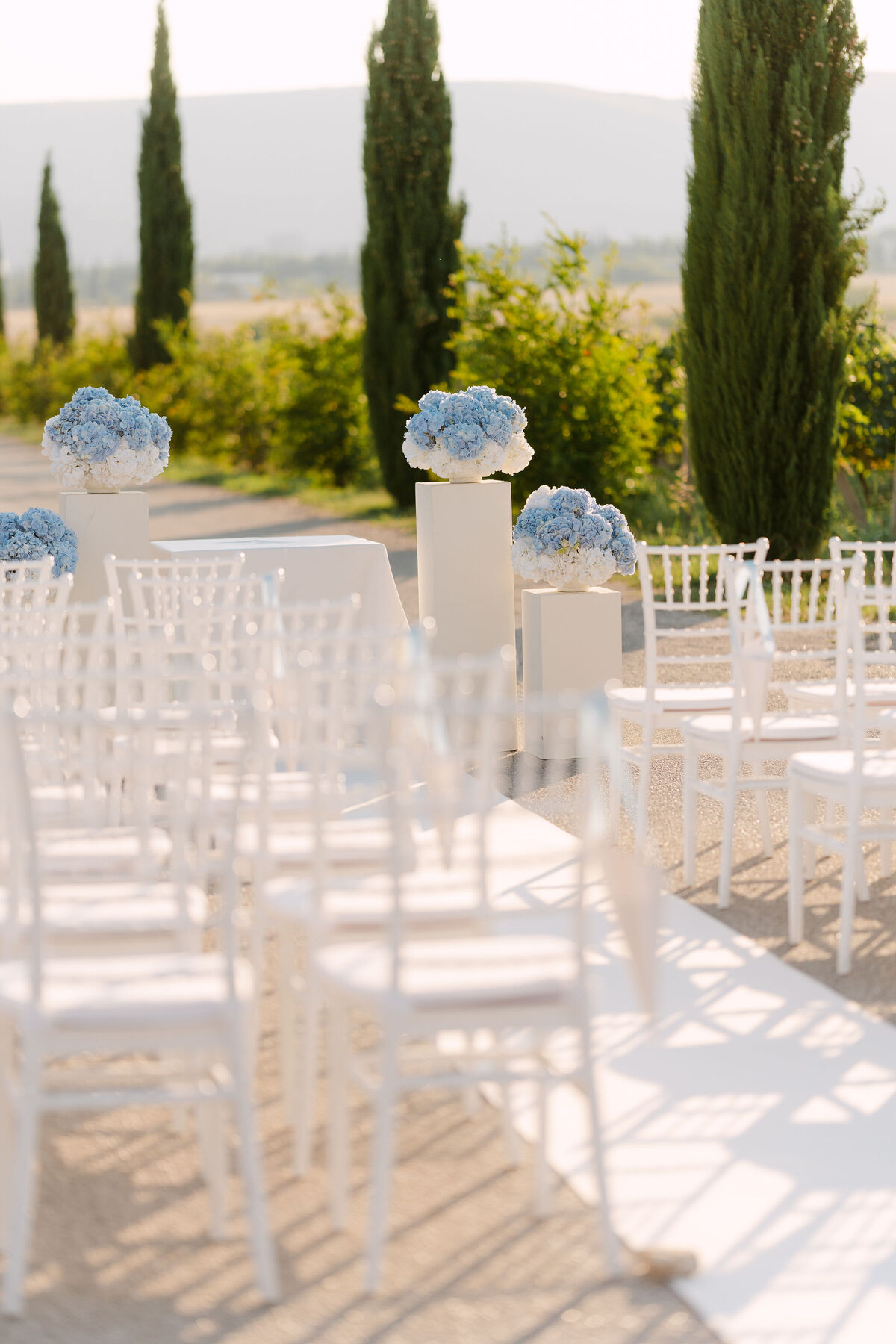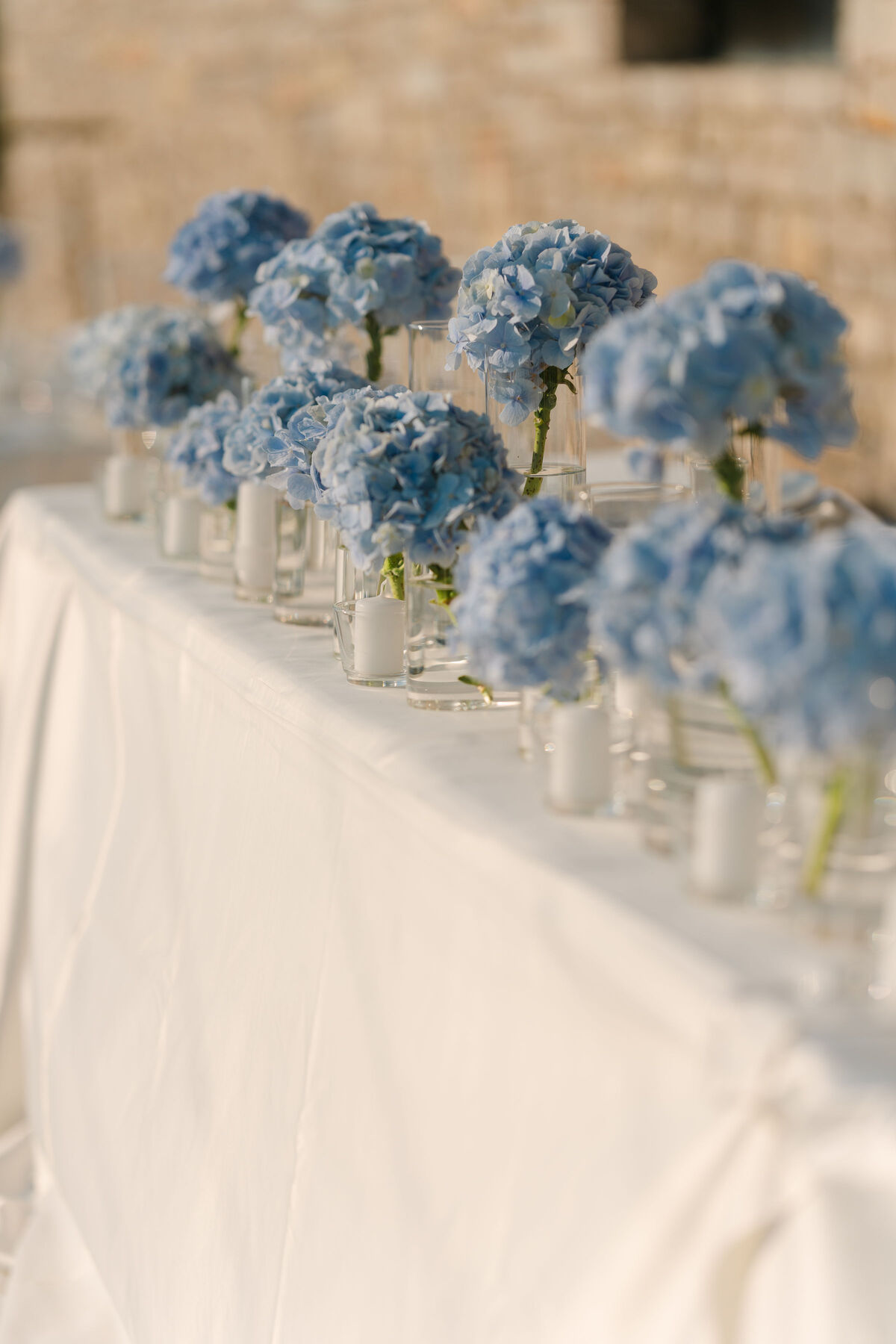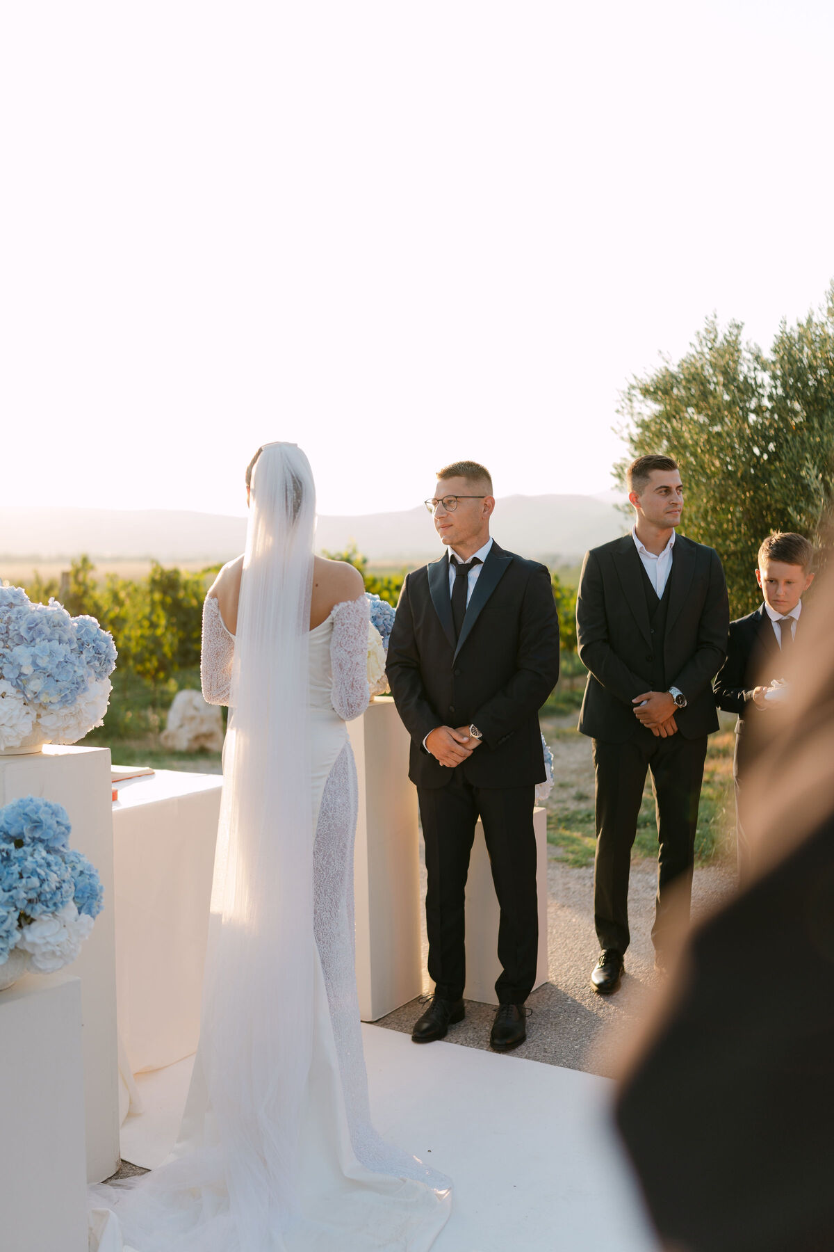 Okupano nježnim sjajem južnog mediteranskog sunca, ovo vjenčanje odvija se u beskrajnim nijansama plave — od horizonta gdje se spajaju priroda i nebo, do nježnih hortenzija koje kao da plešu na toplom povjetarcu.